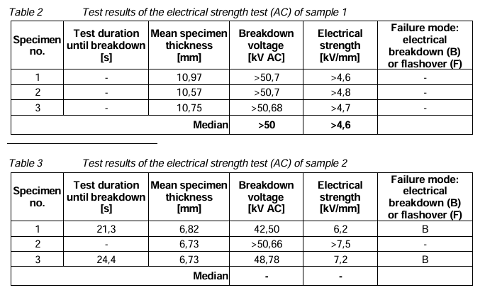 • Electrical strength (AC) according to ASTM D149-09:2014